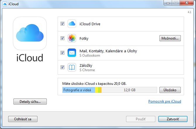 Pre použitie na Windows platforme je najskôr potrebné stiahnuť a nainštalovať "iCloud pre Windows" (kliknite pre stiahnutie). Po inštalácii program spustíme a prihlásime sa pod svojim Apple ID. Zvolíme si možnosti, ktoré chceme využívať: iCloud Drive - vytvorí priečinok, v ktorom máte prístup ku sťahovaniu a nahrávaniu súborov na váš iCloud; Photos - vytvorí priečinok, v ktorom sú uložené fotografie a videá z vášho iCloudu, do tohto priečinku môžete fotografie a videá aj pridávať a tie sa automaticky synchronizujú do ostatných zariadení; Maily, Kontakty, Kalendáre a Pripomienky - synchronizácia s vašim Outlookom po nastavení; Záložky - synchronizácia záložiek s vašim prehliadačom internetu.